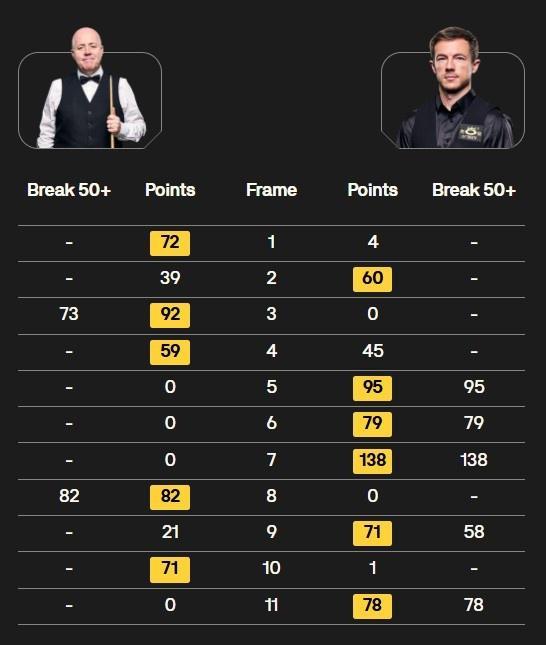 全场比赛杰克·利索夫斯基打出一杆破百(138)和四杆50+(95、79、58、78),约翰·希金斯打出两杆50+(73、82)。